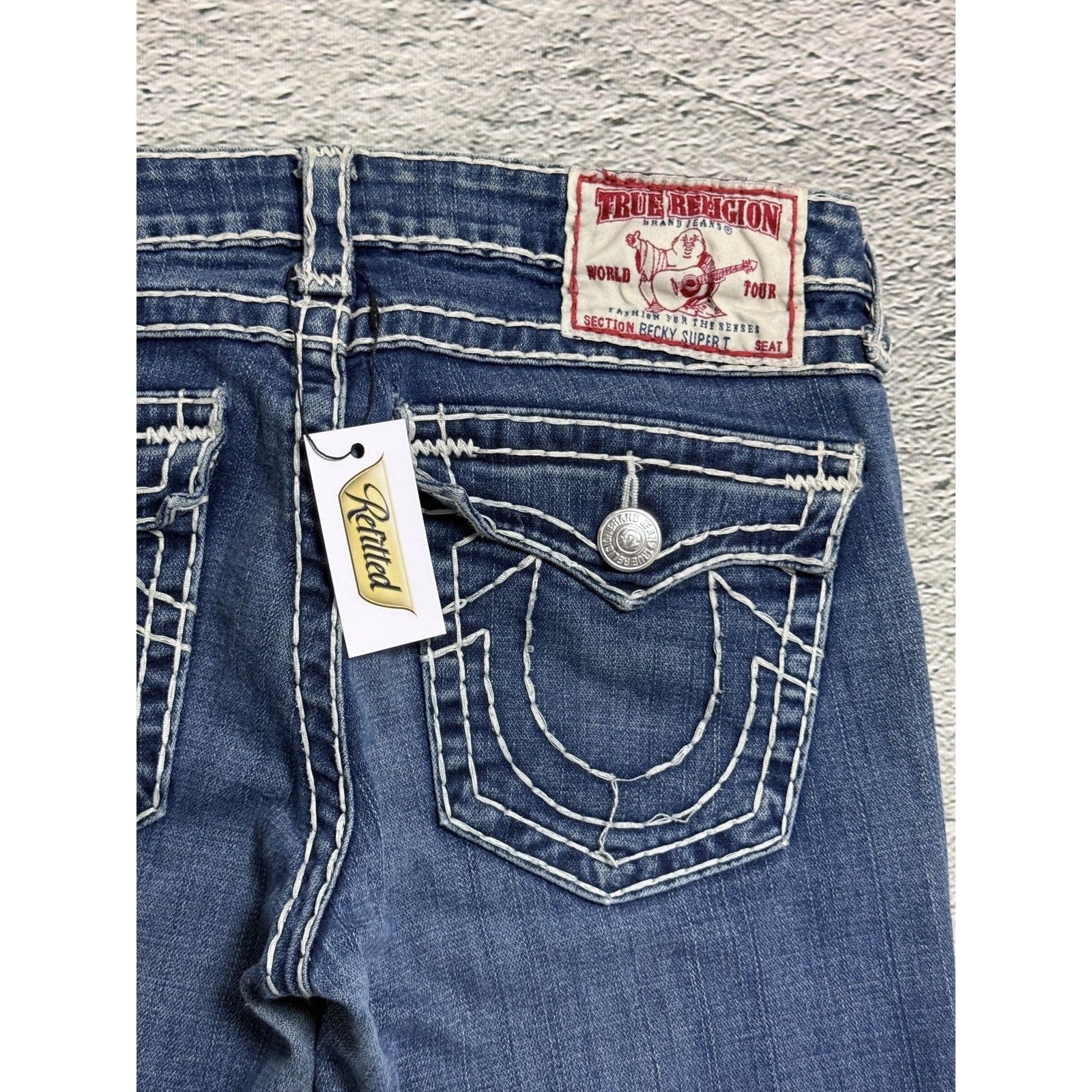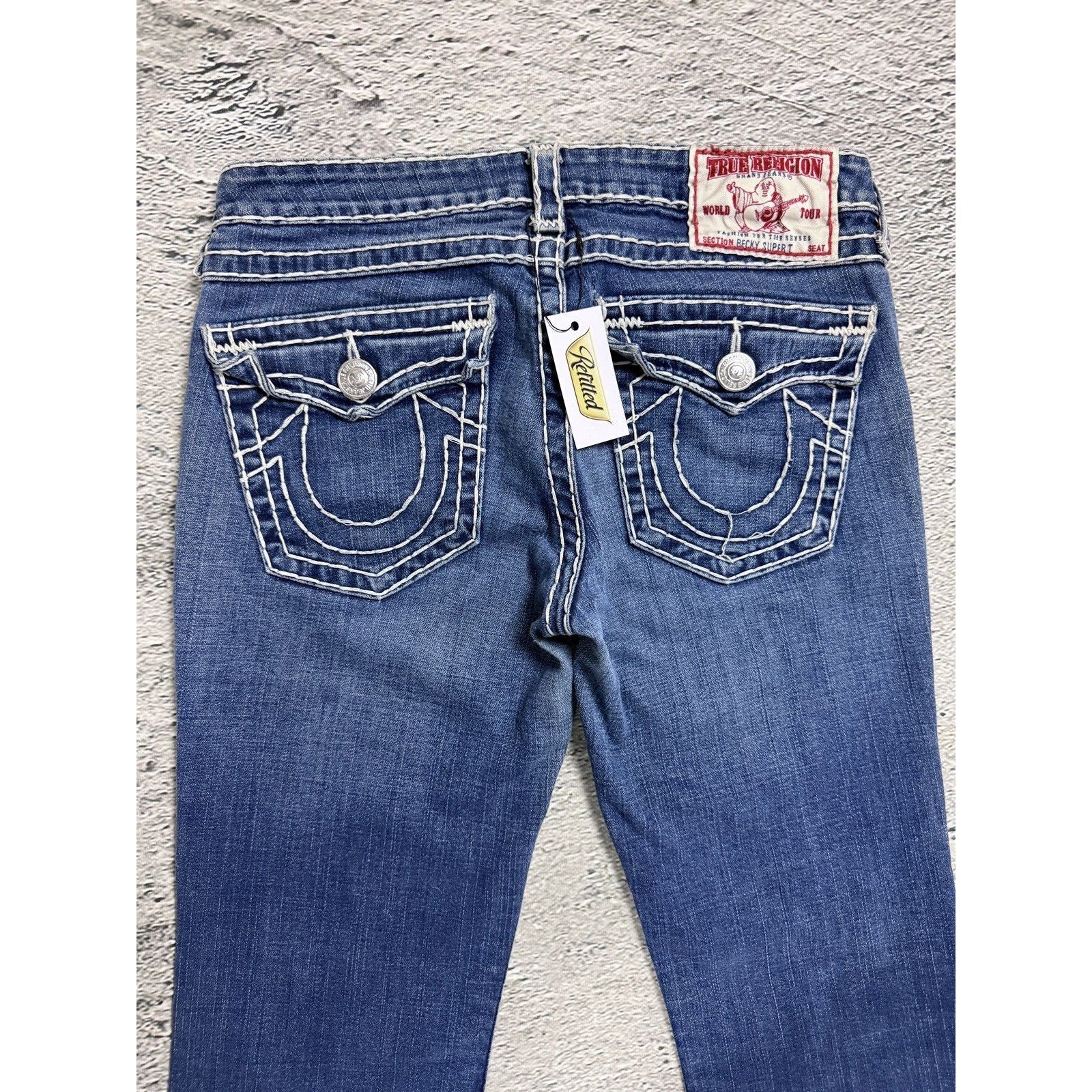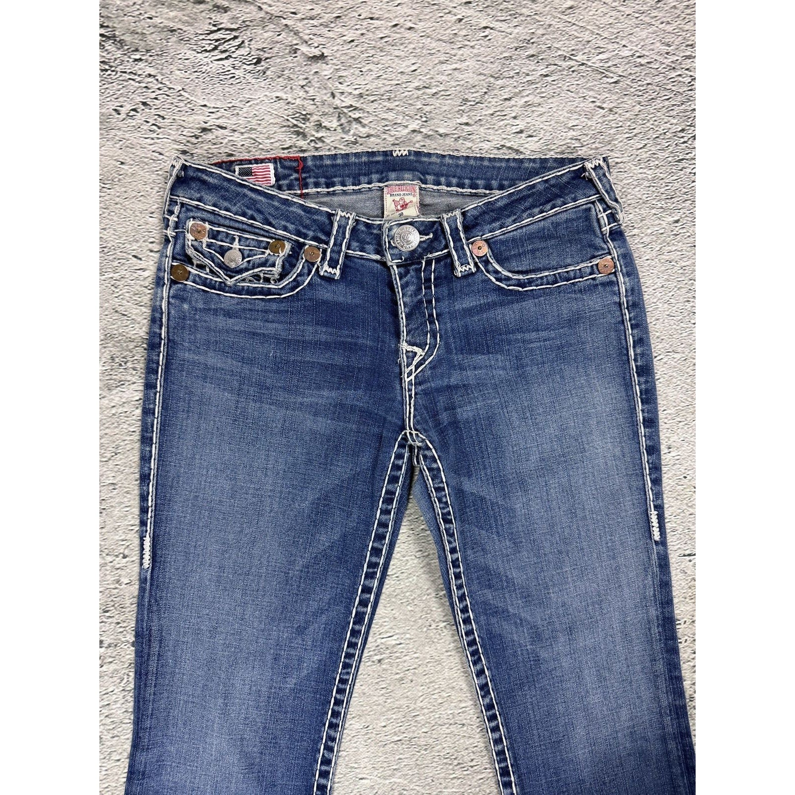 True Religion blue jeans white thick stitching Billy